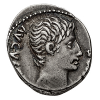 Denario databile al 19 a.C. - Zecca: incerta in Spagna (Colonia Patricia?) - Diritto: testa dell'Imperatore a destra - Rovescio: Marte stante a sinistra con il volto a destra tiene un'aquila legionaria con la mano destra e uno stendardo appoggiato sulle spalle con la leggi tutto