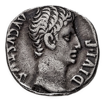Denario databile al periodo 2 a.C .- 4 d.C. - Zecca: Lugdunum - Diritto: testa laureata dell'Imperatore a destra - Rovescio: Caio e Lucio, nipoti dell'Imperatore, stanti di fronte in toga, reggono ciascuno uno scudo e una lancia posati a terra, sopra i quali campeggiano leggi tutto