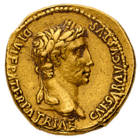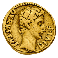 Aureo databile al periodo 2 a.C. - 4 d.C. - Zecca: Lugdunum - Diritto: testa laureata dell'Imperatore a destra - Rovescio: Caio e Lucio, nipoti dell'Imperatore, stanti di fronte in toga, reggono ciascuno uno scudo e una lancia posati a terra, sopra i quali campeggiano leggi tutto