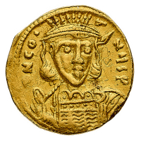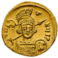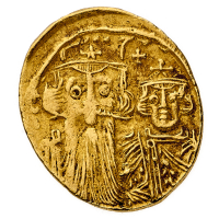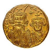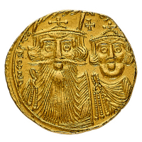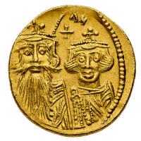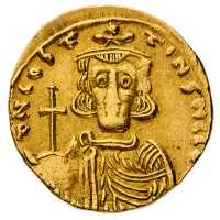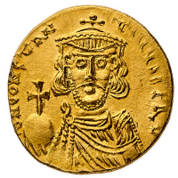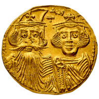 Costantino IV (668-685) - Solido databile al 668 - Zecca: Costantinopoli - Diritto: busto coronato e corazzato dell'Imperatore di fronte - Rovescio: Eraclio e Tiberio, fratelli dell'Imperatore, stanti di fronte; fra loro una croce potenziata su un basamento di tre leggi tutto