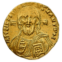 Giustiniano II (Primo Regno 685-695 ) - Solido databile al periodo 692-695 - Zecca: Costantinopoli - Diritto: busto nimbato del Cristo "Pantocrator" di fronte nell'atto di benedire - Rovescio: Giustiniano stante di fronte, tiene con la mano destra una croce potenziata - leggi tutto