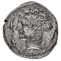 Siracusa - Periodo della Tirannia Dinomenide (485-466 a.C.) - Tetradramma databile al periodo 475-470 a.C. - Diritto: quadriga al passo verso destra sovrastata dalla Vittoria in volo nell'atto di incoronare i cavalli - Rovescio: testa di Aretusa a destra; attorno leggi tutto