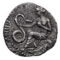 Selinunte - Litra databile al periodo 348-336 a.C. - Diritto: ninfa seduta su una roccia a sinistra tocca un serpente con la mano destra e solleva la sinistra sopra il capo - Rovescio: toro androcefalo stante a destra sormontato da una foglia di silene - gr. 0,63 - Non leggi tutto