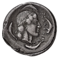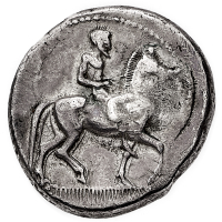 Siracusa - Periodo della Tirannia Dinomenide (485-466 a.C.) - Didramma databile al periodo 478-475 a.C. - Diritto: cavaliere nudo su cavallo al passo verso destra mentre guida un secondo cavallo - Rovescio: testa di Aretusa a destra; attorno quattro delfini - gr. 8,59 - leggi tutto