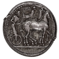 Siracusa - Periodo della Seconda Democrazia (466-405 a.C.) - Tetradramma databile al periodo 466-460 a.C. circa - Diritto: quadriga al passo verso sinistra sovrastata dalla Vittoria in volo nell'atto di incoronare l'auriga - Rovescio: testa di Aretusa a destra; attorno leggi tutto
