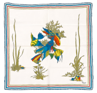 in cotone multicolor, con disegno di pesci tropicali su fondo marino.