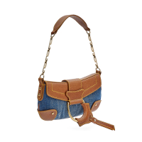 in denim blu e pelle biscotto, interno in tessuto maculato. Manico con catena logata e salvaspalla in pelle biscotto. Chiusura con patta fermata da magnete. Hardware in metallo dorato.