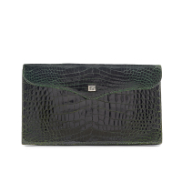 in coccodrillo verde smeraldo, interno in pelle verde. Chiusura con patta logata fermata a pressione. Una striscia di pelle di coccodrillo posteriore permette di infilare il dorso della mano. Hardware in metallo argentato e dorato.