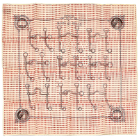 in cotone beige e pois rossi con rappresentazioni in grigio di diversi morsi da sella.