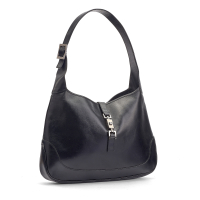 in pelle nera, interno in tessuto nero logato. Tracolla in pelle regolabile, chiusura a pistone logato. Hardware in metallo argentato.