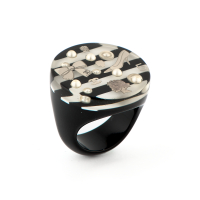 in metacrilato nero, bianco e trasparente, presenta inclusioni di perle sintetiche e loghi iconici in lamina dorata.