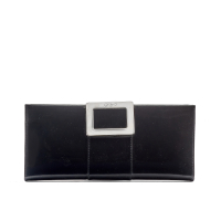 in vernice nera, interno in pelle argento. Chiusura a scatto fermata da fibbia oversize logata. Hardware in metallo argentato.