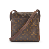 in tela Monogram marrone e dettagli in vacchetta, interno in tessuto marrone. Tracolla regolabile in tela logata, chiusura con zip. Una tasca frontale. Hardware in metallo dorato.