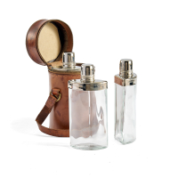 La custodia in cuoio marrone con manico, racchiude tre fiaschette di forma sfaccettata in vetro e metallo argentato. Chiusura con zip.