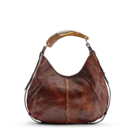 in pelle cioccolato, interno in tessuto scamosciato marrone. Tracolla in corno e pelle regolabile, chiusura con magnete. Hardware in metallo argentato.