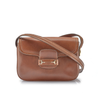 in pelle marrone, interno in pelle beige. Tracolla in pelle. Chiusura con patta con dettaglio Horsebit centrale. Hardware in metallo dorato.
