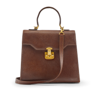 in pelle di cinghiale marrone, interno in pelle cammello. Manico e tracolla amovibile in pelle marrone. Chiusura con patta fermata da serratura a scatto. Hardware in metallo dorato.