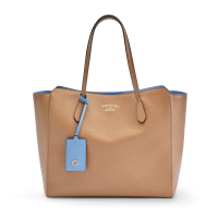 in pelle martellata beige, interno in pelle martellata azzurro e tessuto beige. Doppio manico in pelle beige, chiusura con magnete. Con porte adresse amovibile logato in pelle martellata bicolore. Hardware in metallo argentato.