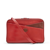 in pelle martellata rossa e pelle cuoio, interno in pelle scamosciata rossa. Tracolla amovibile. Chiusura con cerniera a doppio cursore. Due tasche frontali, una chiusa con zip. Una tasca posteriore fermata da poussoir. Hardware in