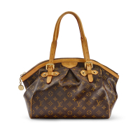 in tela Monogram marrone e dettagli in vacchetta. Interno in tessuto beige. Doppio manico in vacchetta, chiusura con cerniera a doppio cursore con tiretto logato. Completa di porte adresse, lucchetto e set di chiavi. Una tasca