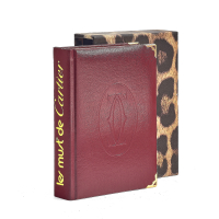 cofanetto in edizione limitata rilegato in pelle bordeaux con logo Cartier in rilievo, protetto da una custodia rigida animalier. Un testo su Les must de Cartier, boutique a 7 place Vendome