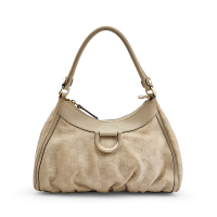 in pelle Guccissima beige, interno in tela logata. Manico in pelle, chiusura con zip. Anello a D logato frontale. Hardware in metallo argentato.