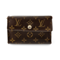 in tela Monogram marrone e interno in pelle. Uno scomparto portasoldi, tredici spazi portatessere. Tre tasche, quella centrale chiusa da zip. Una tasca esterna nascosta da patta fermata da poussoir. Hardware in metallo dorato.