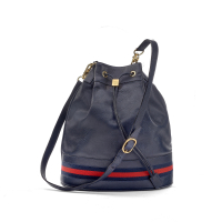 in pelle blu con iconica riga Web rossa e blu, interno in camoscio blu. Tracolla in pelle amovibile, chiusura con coulisse fermata da dettaglio logato. Hardware in metallo dorato.