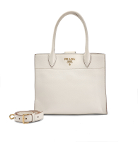 in pelle di vitello crema, interno in tessuto beige. Doppio manico, tracolla amovibile e regolabile in pelle crema. Chiusura con piccola patta fermata da magnete. Hardware in metallo dorato.