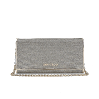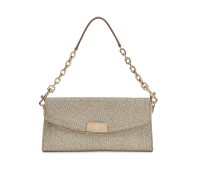 in micro rete sintetica oro glitterato e dettagli di pelle in tinta. Interno in pelle beige. Uno scomparto chiuso da zip, uno libero. Tre tasche piatte, dodici spazi portatessere. Manico amovibile a catena. Chiusura con patta