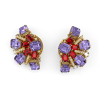 in metallo dorato, perle di vetro, cristalli taglio smeraldo ametista e rubino, cristalli trasparenti.