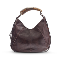 in pelle cioccolato, interno in tessuto scamosciato marrone. Tracolla in corno e pelle regolabile, chiusura con magnete. Hardware in metallo argentato.