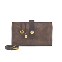 in pelle scamosciata marrone, interno a cinque scomparti in pelle di agnello marrone, tre chiusi da cerniera con tiretto logato. Tracolla amovibile in pelle marrone. Chiusura con patta in pelle fermata da girello con logo. Hardware in