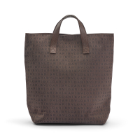 in pelle marrone con motivi tagliati al laser. Doppio manico, una bustina interna in tessuto tecnico marrone chiusa da zip.