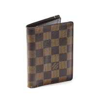 in tela Damier Ebène, interno in pelle marrone personalizzato con iniziali R.P. Uno scomparto portasoldi, una tasca piatta, sette spazi portatessere.