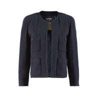 in tweed blu, tripla impuntura in tinta sui bordi e sulle maniche. Quattro taschine con bottoni neri CC. Tre bottoni con logo su ciascun polsino. Fodera interna logata nera.