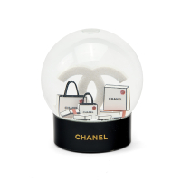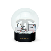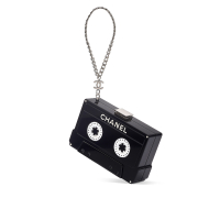 in lucite nera con dettagli bianchi. Interno in tinta. Logo e firma su targhetta ovale interna. Manico a catena con logo. Chiusura a scatto. Hardware in metallo argentato.