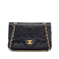 in pelle di agnello nero con lavorazione matelassé. Interno in pelle bordeaux. Doppia catena dorata con intreccio di pelle in tinta. Chiusura con patta fermata da CC a girello. Certificato Chanel di pulitura. Hardware