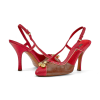 in edizione limitata, disegnata dall'artista Takashi Murakami, in Varano rosso e pelle marrone. Decorazione di ciliege e borchie in ottone dorato. Modello indossato nella sfilata P/E2005.