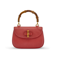 in pelle rossa, interno in camoscio rosso. Manico e chiusura a torsione in bamboo. Hardware in metallo dorato.