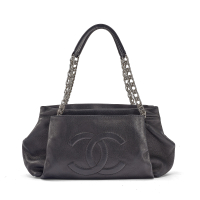 in Caviar trapuntato nero, interno in gros grain bordeaux. Doppio manico a catena con salvaspalla e intreccio di pelle in tinta. Tre scomparti chiusi da zip, una tasca frontale con logo e una tasca anteriore. Hardware in metallo