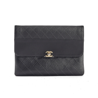 in pelle di agnello trapuntata nera, interno in gros grain bordeaux. Chiusura con patta fermata da CC a girello. Hardware in metallo dorato e brunito.