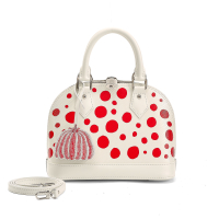 in edizione limitata, disegnata dall'artista Yayoi Kusama. In pelle Epi bianca, interno in tessuto scamosciato rosso. Manico e tracolla amovibile e regolabile in pelle bianca. Una tasca esterna a pois rossi con specchietto. Borsellino con zip a forma di zucca. Hardware