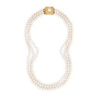 in metallo dorato e triplo filo di perle di vetro con chiusura gioiello.