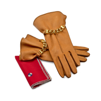 in cervo biscotto e dettagli a catena logata dorata. La Gavroche in seta rossa con bordino grigio. Iconico logo grigio e blu.