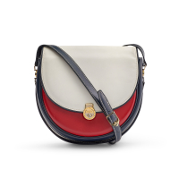 in pelle rossa, blu e bianca. Interno in cinghiale blu. Tracolla regolabile, chiusura con patta fermata da girello logato. Hardware in metallo dorato e argentato.