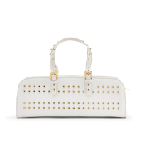 in pelle bianca e borchie metalliche, interno in tessuto logato blu. Doppio manico regolabile in pelle bianca e borchie, chiusura con cerniera fermata da tiretto logato. Hardware in metallo dorato.