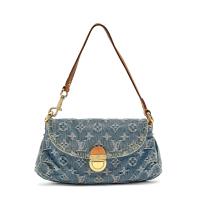 in tela denim blu Monogram, interno in tessuto scamosciato giallo senape. Dettagli e tracolla amovibile da un lato che permette di portare la borsa al polso, in pelle vacchetta. Chiusura con patta fermata da chiusura tic-tuc.