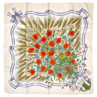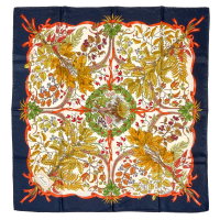in cashmere e seta, con disegni paisley su sfondo oro, beige e marrone.