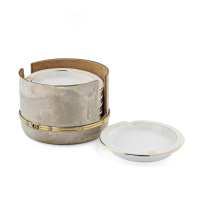 in ceramica bianca con bordo oro e logo. Contenitore in metallo argentato e vellutino beige interno. Fascia logata dorata.
